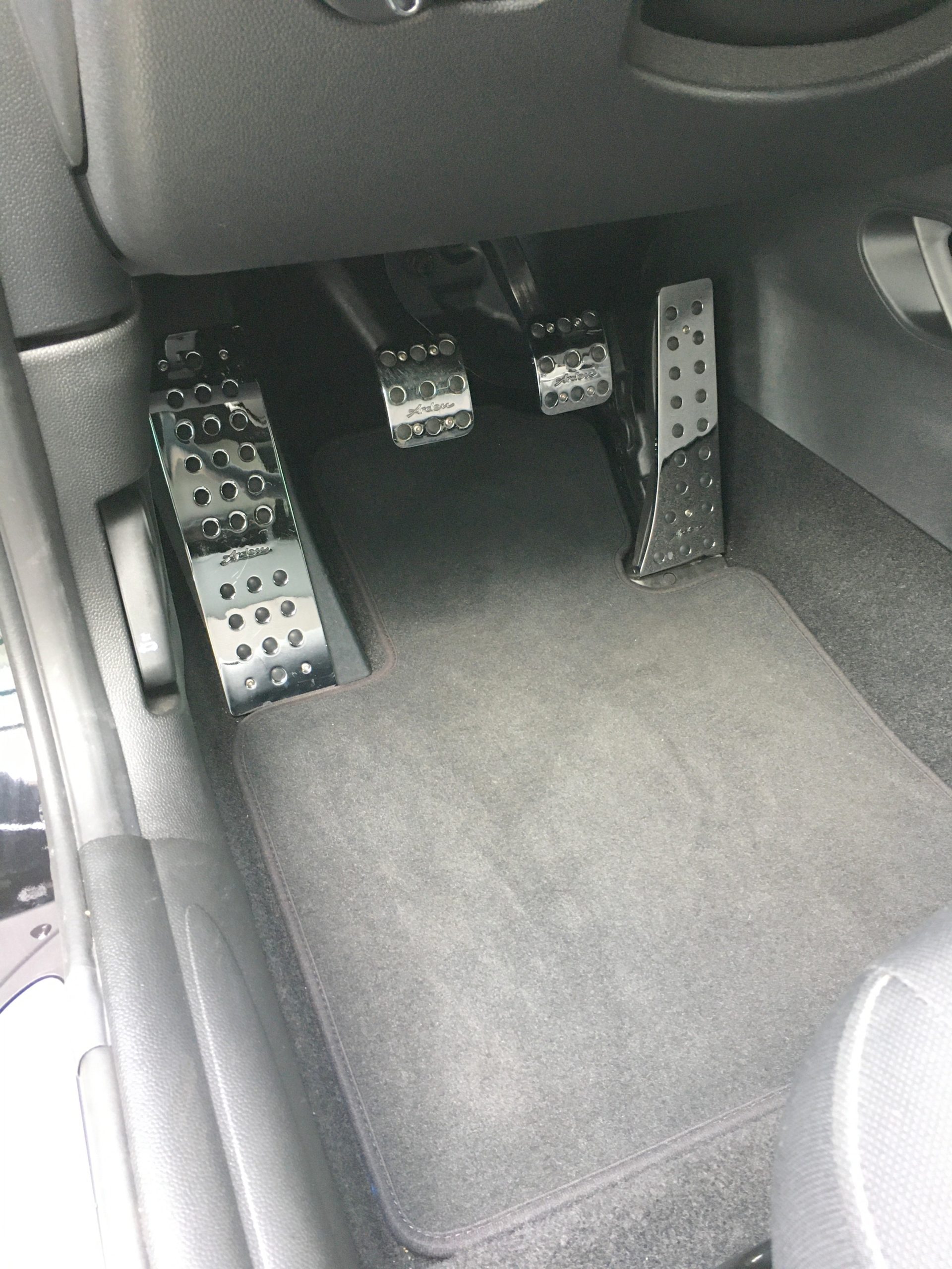 Aluminium Pedalsatz für Gas-, Brems- und Kupplungspedal sowie Fußstütze. Hochglanz poliert mit Sicherheitsnoppen und Arden Gravur. Für höhere Trittsicherheit und eine sportliche Optik.
