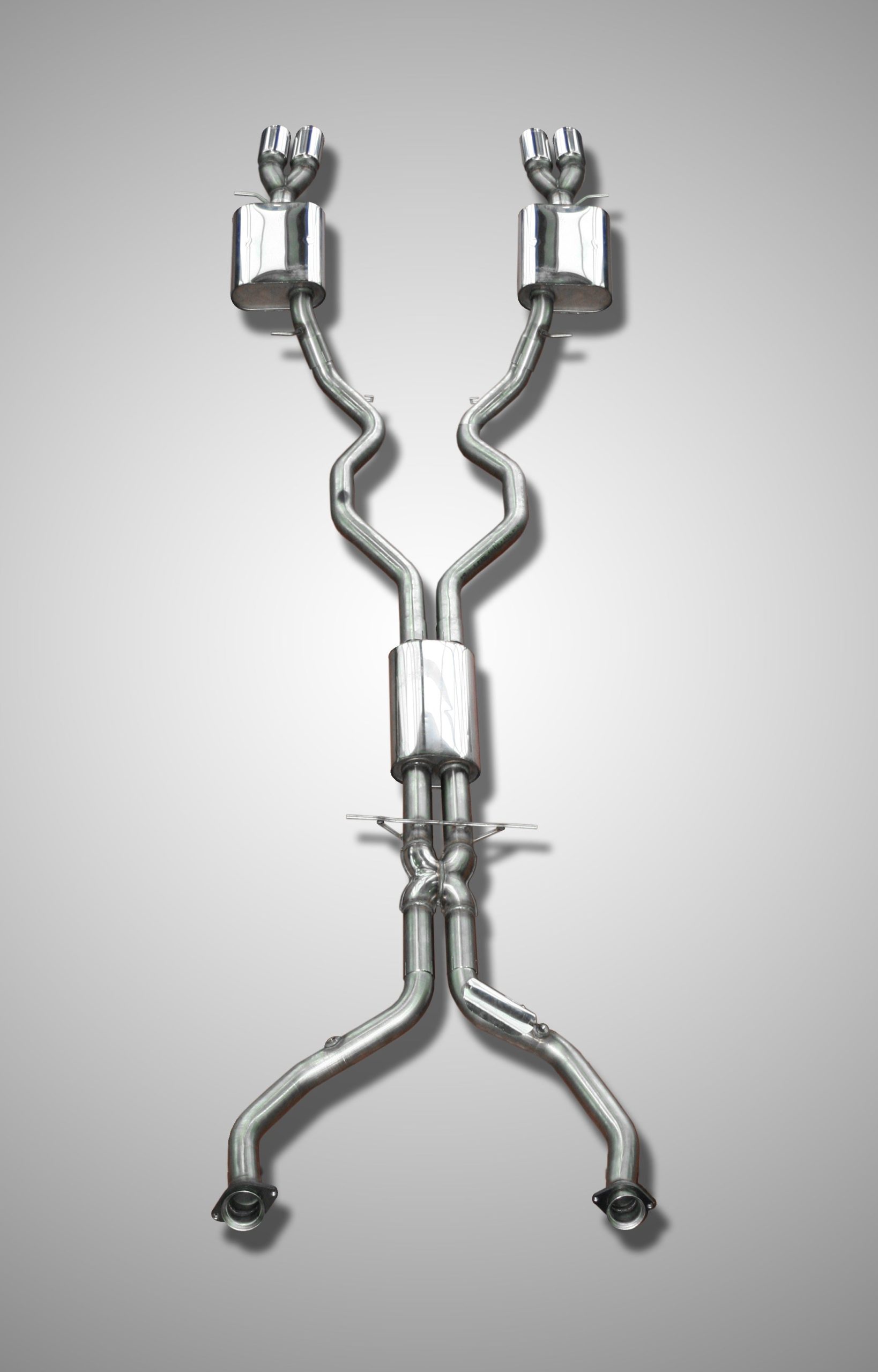 Komplett aus verchromtem Edelstahl gefertigte Abgasanlage bestehend aus Vor- und Endschalldämpfern. Endrohre 4x90mm mit Arden Schriftzug. Diese Abgasanlage liefert neben einem kraftvollen V8-Sound ca. 12 PS (9 kW) Mehrleistung, verbunden mit einem deutlich besseren Ansprechverhalten des Motors durch verringerten Abgasgegendruck.