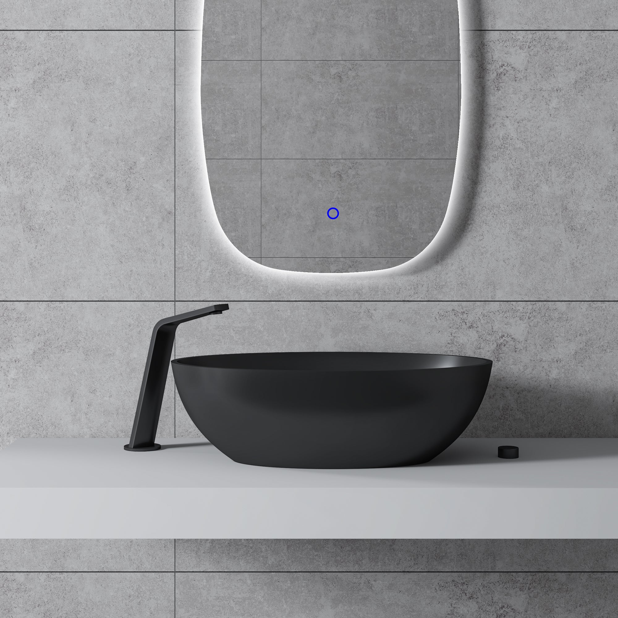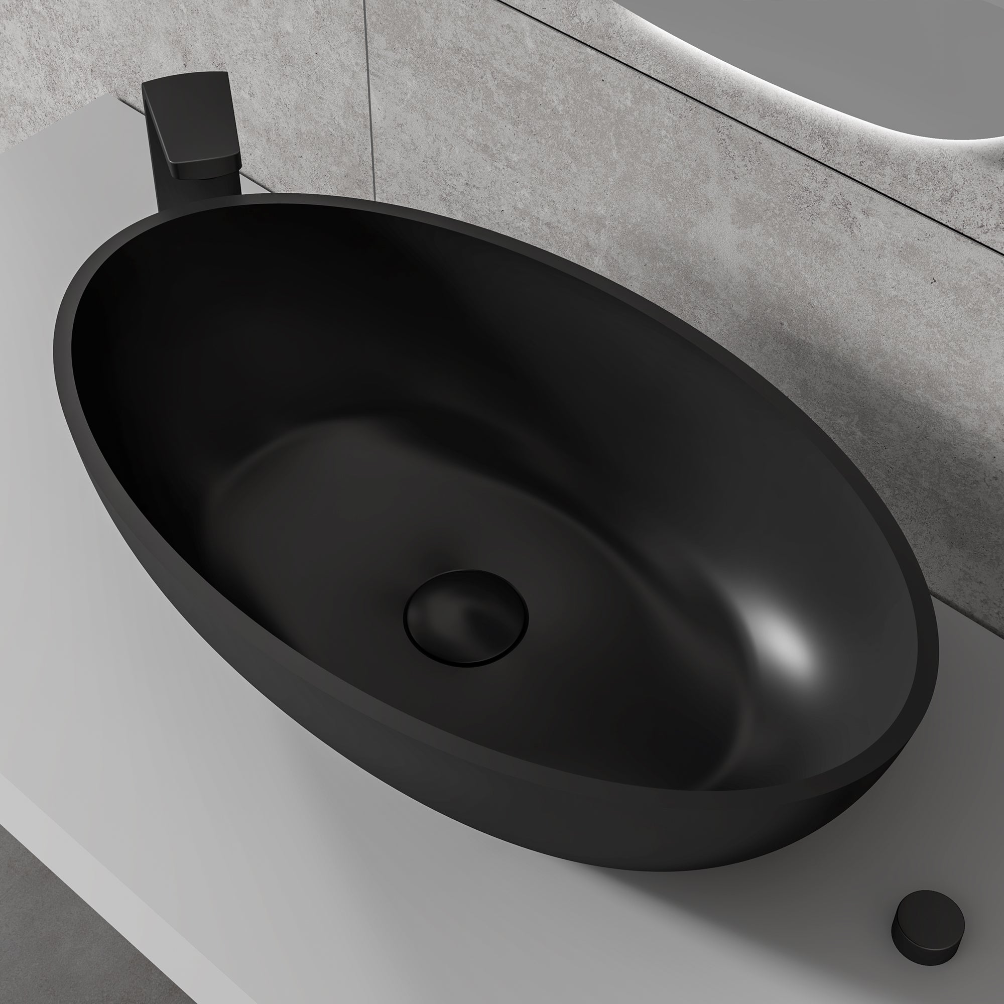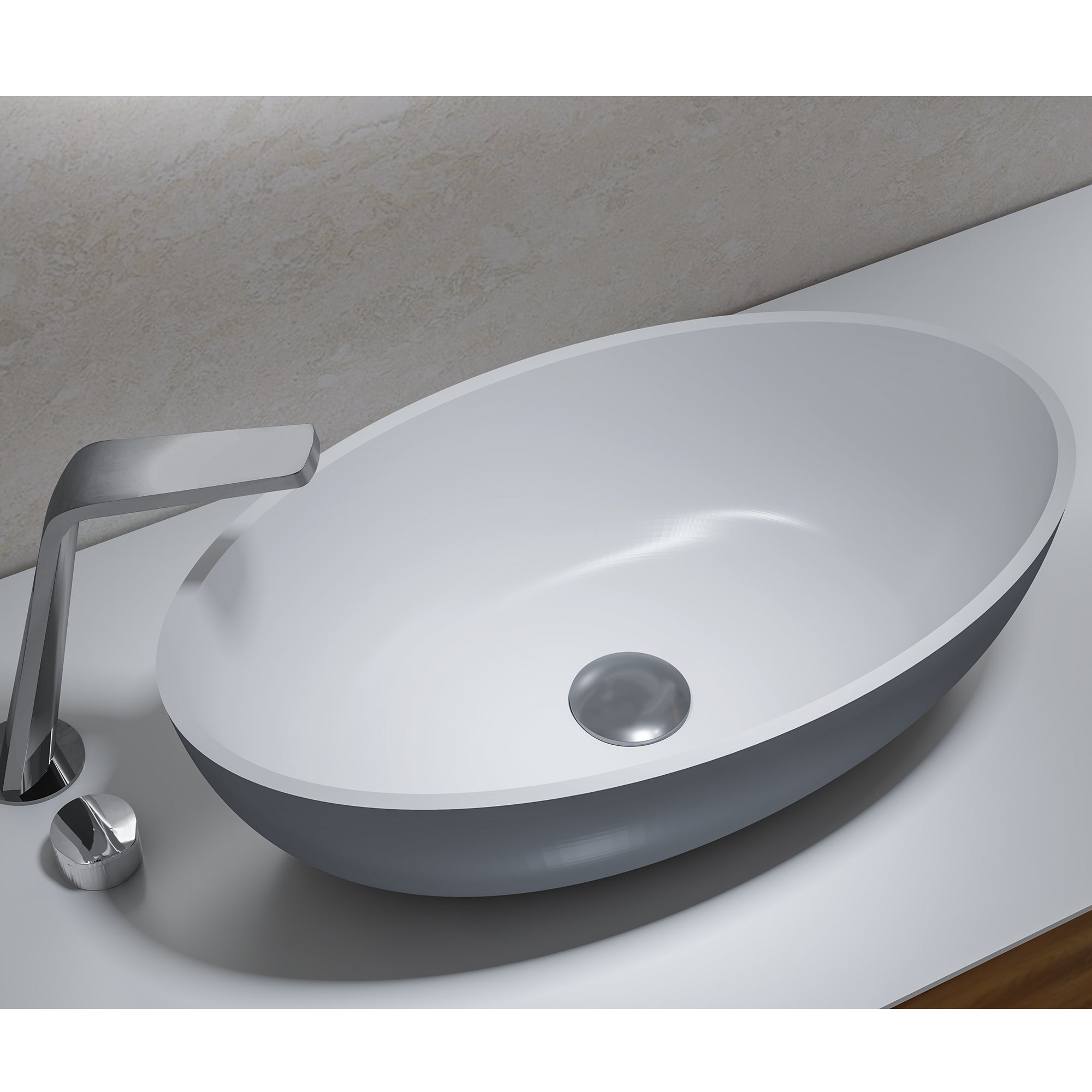 Das moderne ovale Aufsatzwaschbecken aus hochwertigen Mineralguss Solid Stone ist in drei modernen Farben erhältlich. Sie haben die Wahl zwischen einem weiß matten, weiß /grauen oder einem komplett schwarz matten Waschbecken.