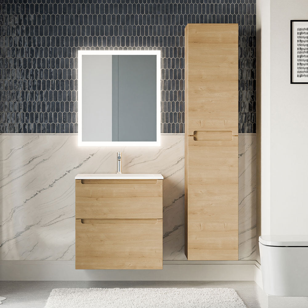 Modernes 60 cm Badmöbel Set VIREO mit Keramik Waschbecken in Weiß ✓ Farben wählbar ✓ Inkl. LED-Spiegel & Hochschrank ✓ 5 Jahre Garantie ✓ Jetzt kaufen!
