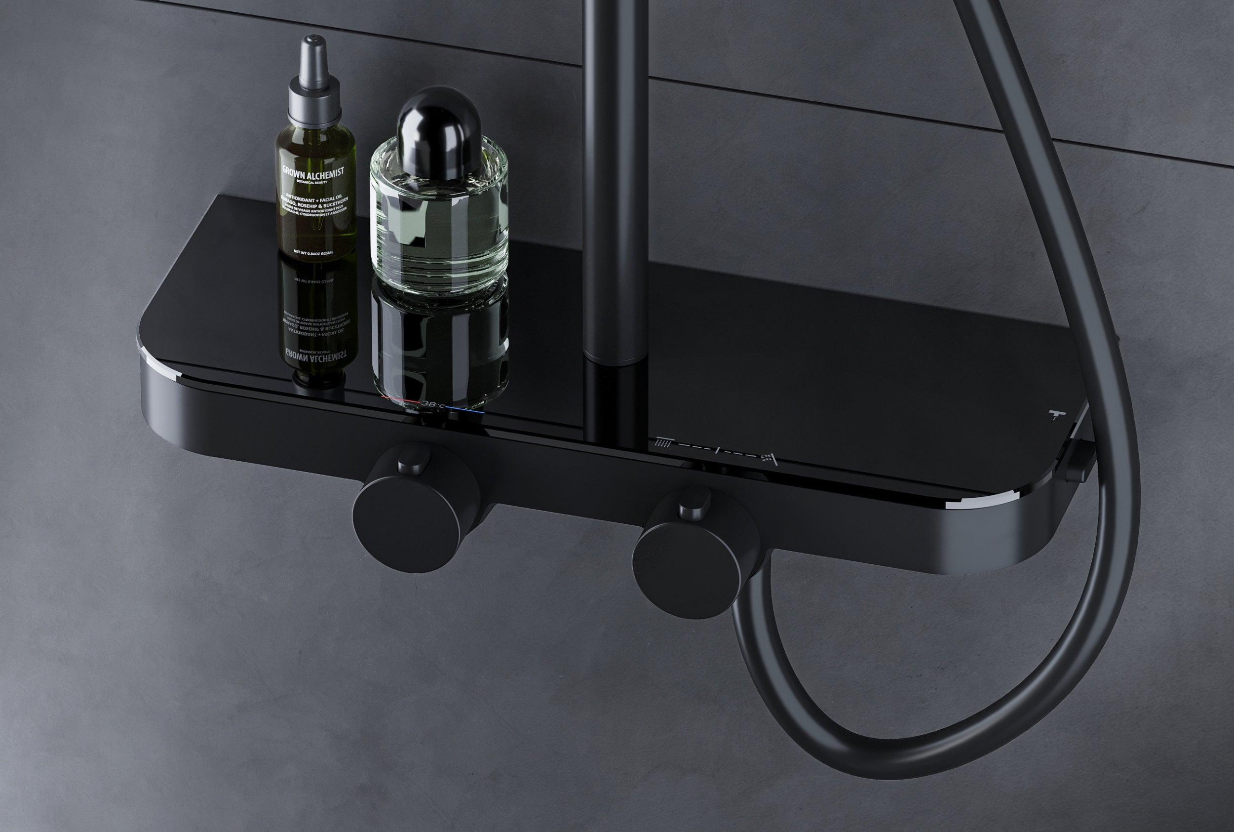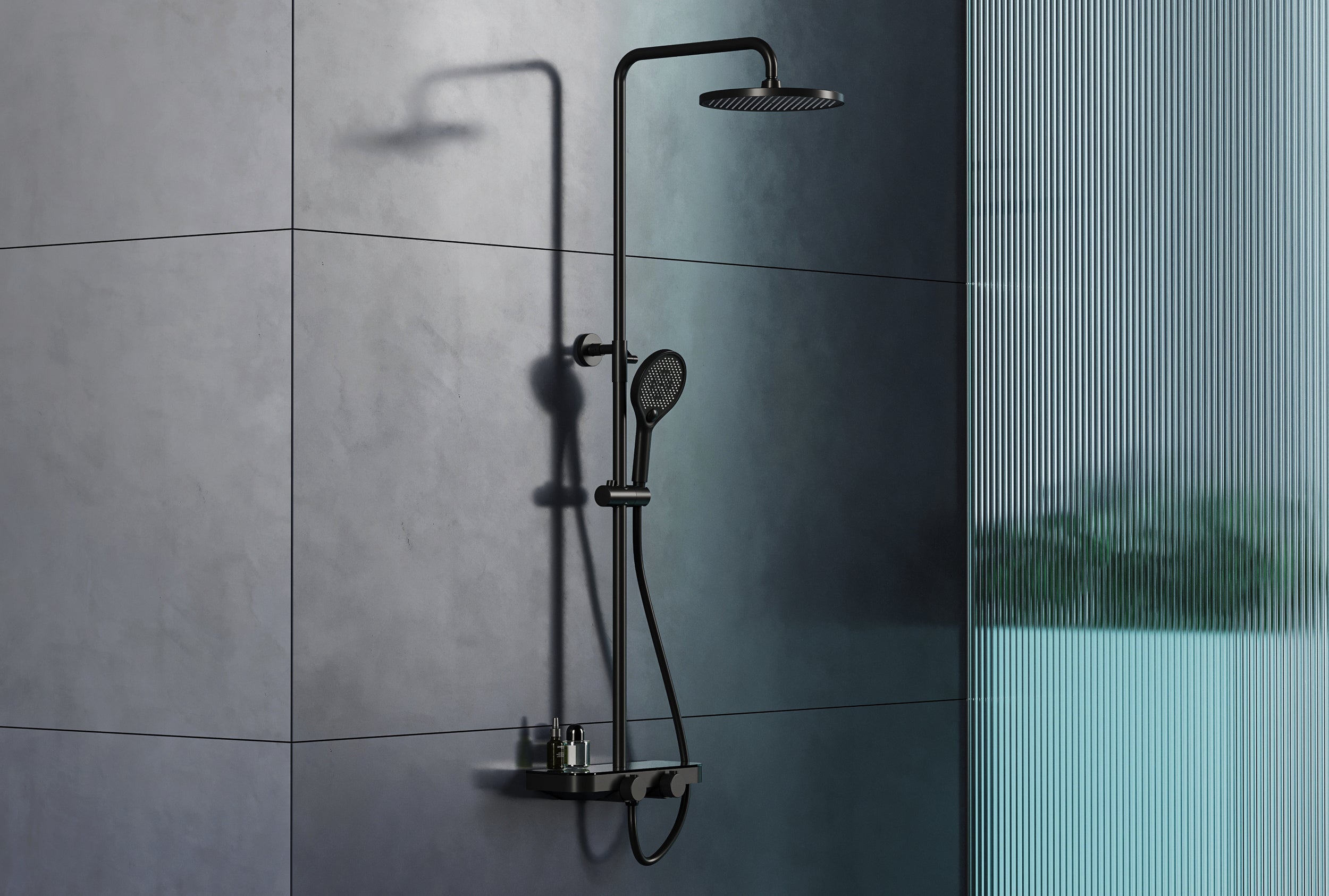 • Thermostat-Duschsystem mit Ablagefläche aus Glas