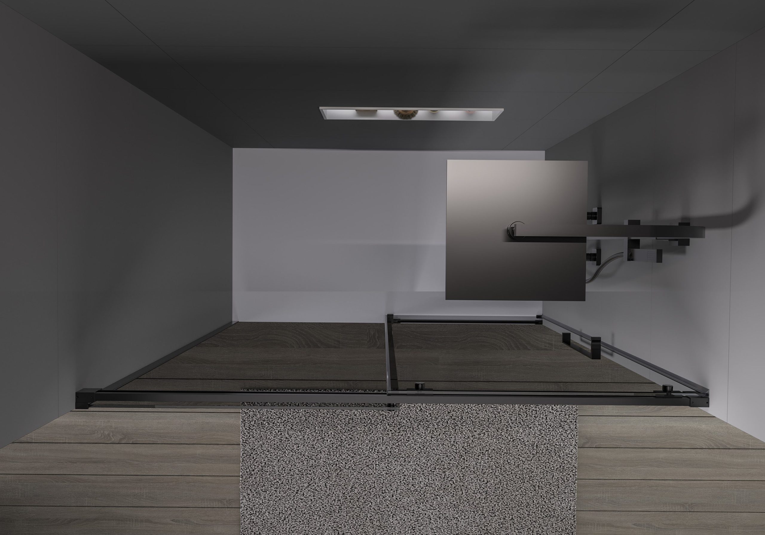 Das Alu-Profil mit schwarz matter Oberfläche erscheint sehr elegant – auch im Zusammenspiel mit weiteren schwarzen Armaturen. Das Rollensystem zeichnet sich durch ruhiges Laufverhalten aus und ist hinter einer Aluminiumleiste am obersten Türrand geschickt verdeckt. Der formschöne Stangengriff aus Edelstahl zeigt sich in großzügiger Länge und hinterlässt ein hochwertiges Erscheinungsbild.