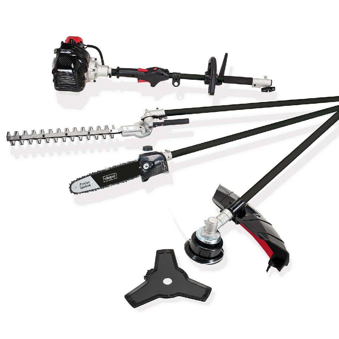 Das scheppach Multifunktionsgerät 4 in 1 kann mit nur einem Handgriff vom Rasentrimmer zur Motorsense, Heckenschere oder zum Hochentaster umgebaut werden. Im Handumdrehen erledigen Sie so Gartenarbeiten wie Rasenpflege, Heckenpflege und Baumpflege.