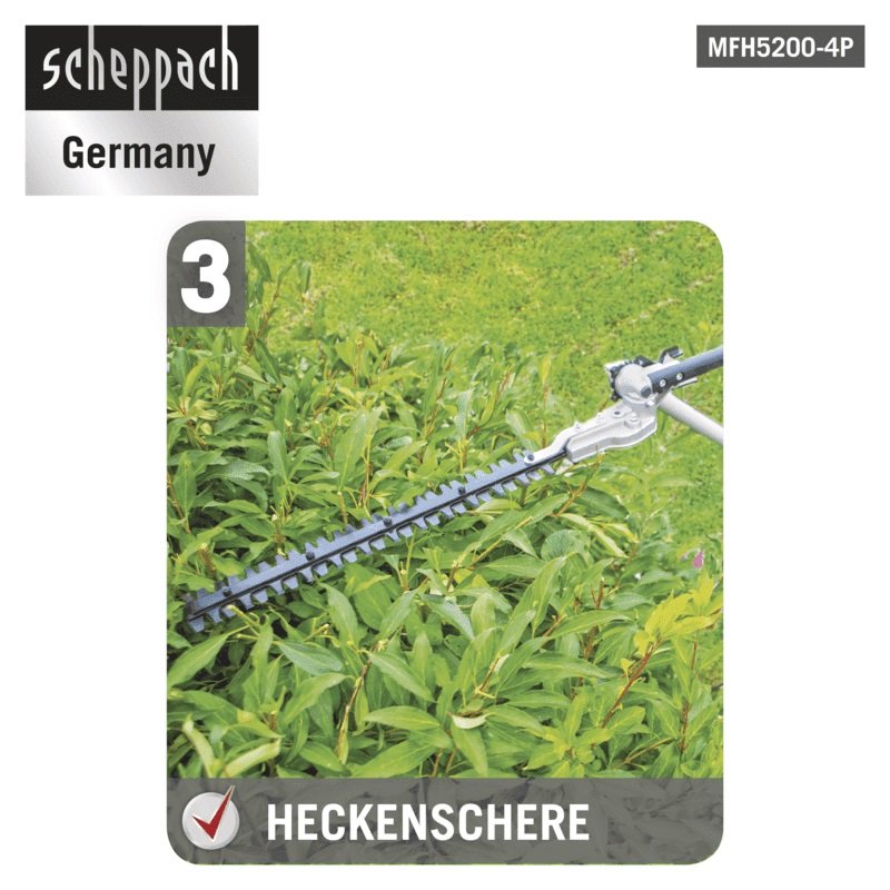 Das scheppach Multifunktionsgerät 4-in-1 kann mit nur einem Handgriff vom Rasentrimmer zur Motorsense, Heckenschere oder zum Hochentaster umgebaut werden. Im Handumdrehen erledigen Sie so Gartenarbeiten wie Rasenpflege, Heckenpflege und Baumpflege.