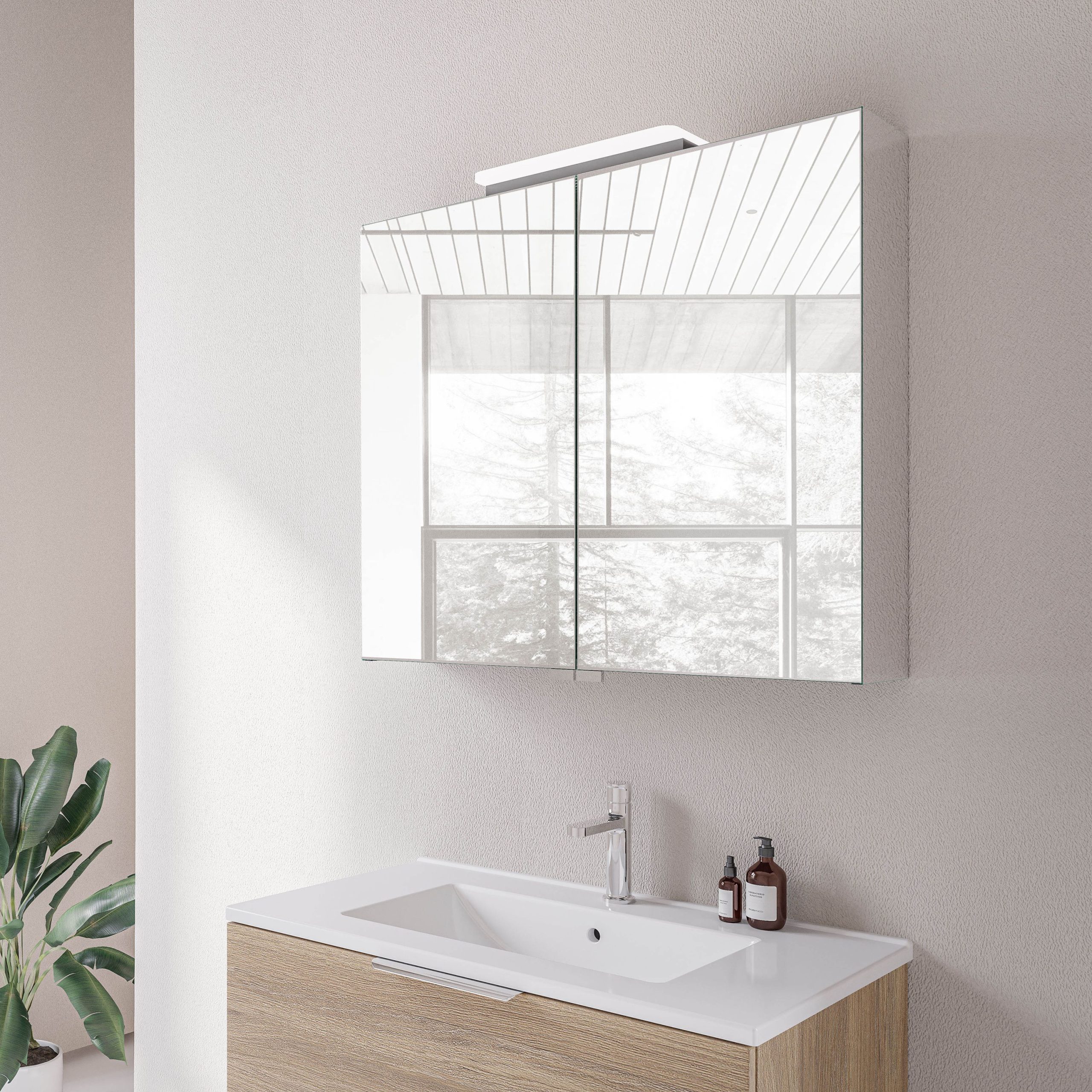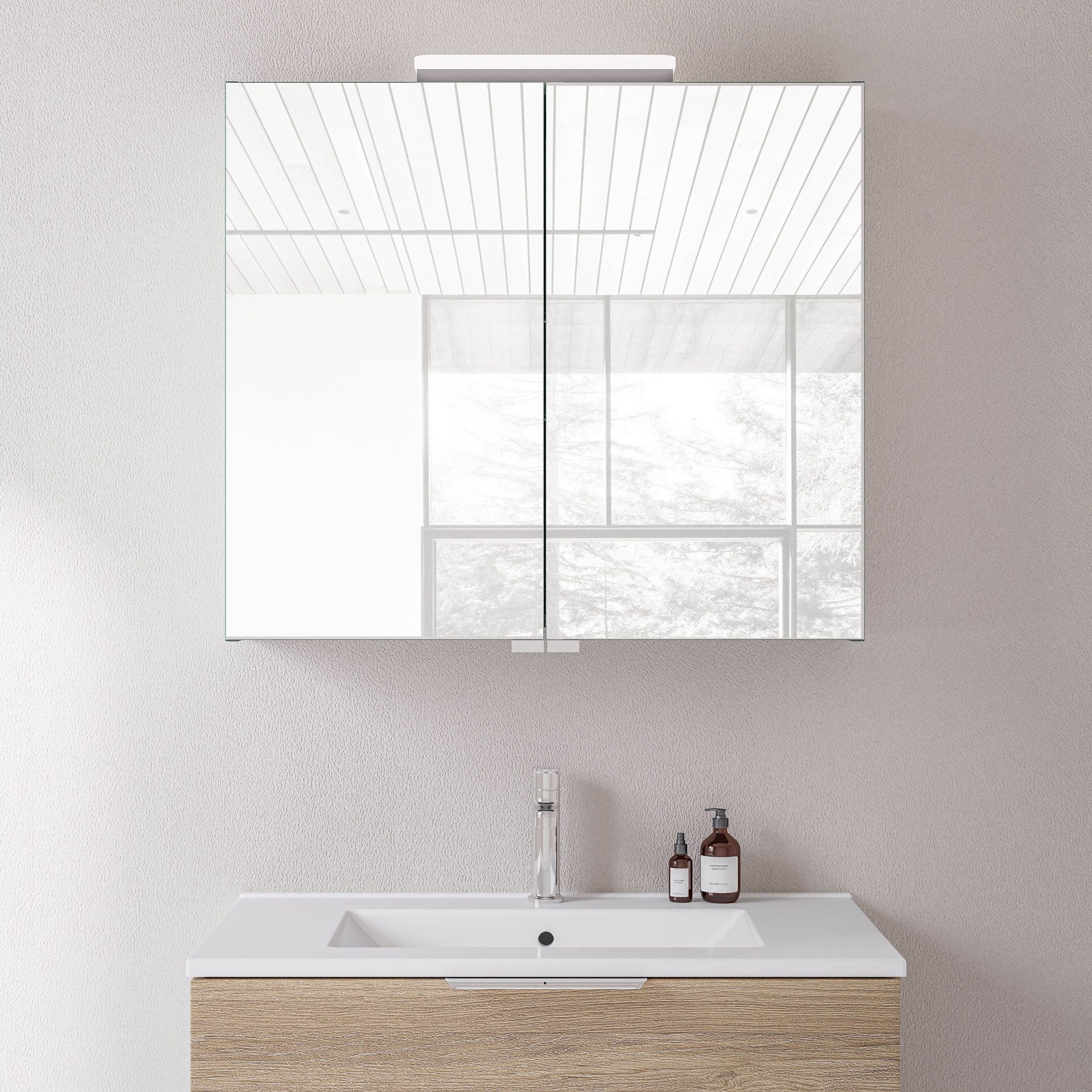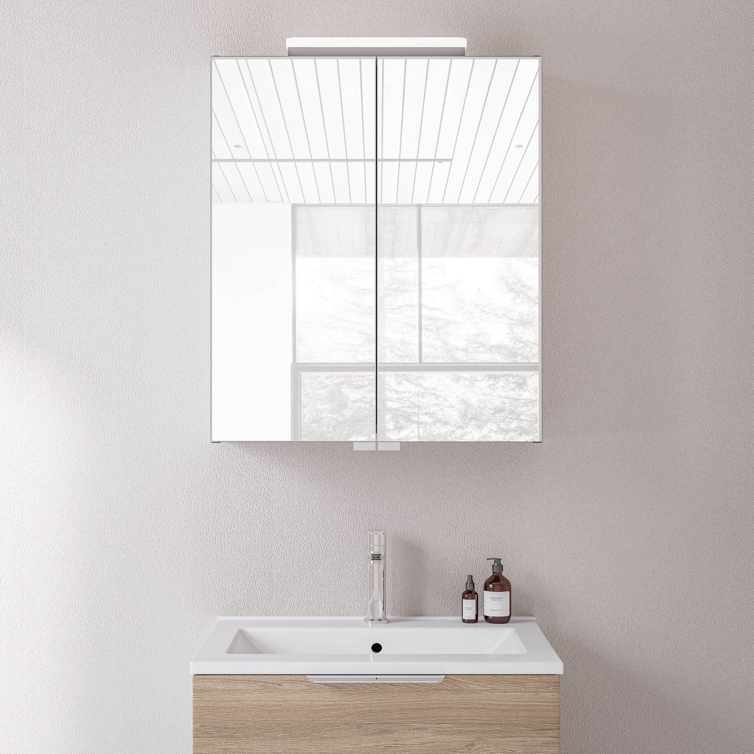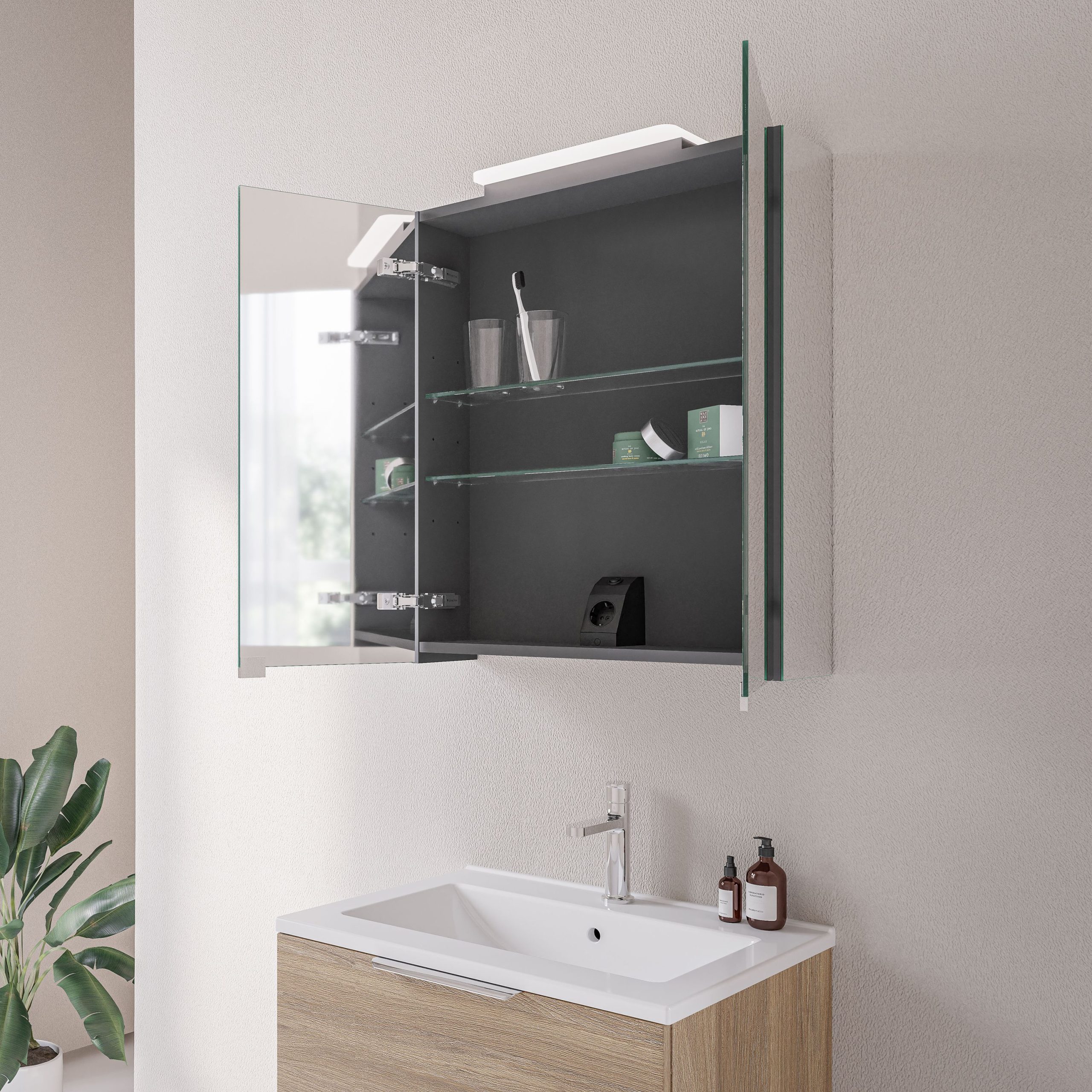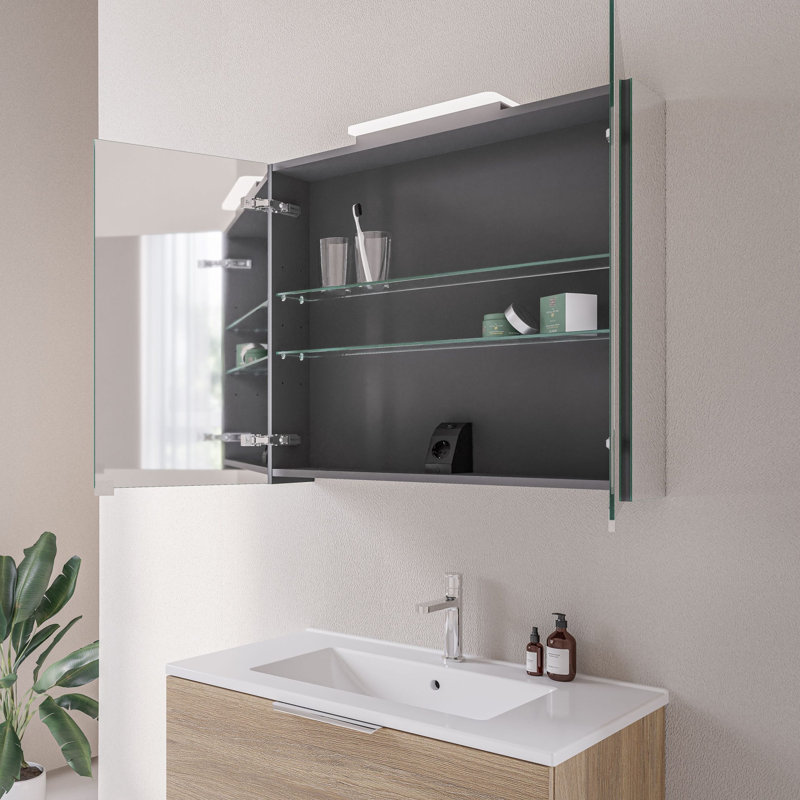 Spiegelschrank NEO mit LED-Beleuchtung & Steckdose – Breite wählbar – 2 Türen