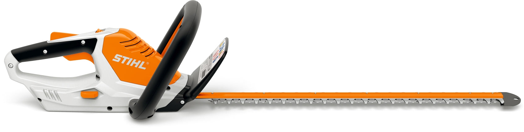 Ein Führungsschutz schützt die Spitze des Messerbalkens vor Beschädigung bei Arbeiten in Wand- und Bodennähe. Der Führungsschutz der Heckenschere ist mit einer integrierten Einhängeöse für die Wandbefestigung ausgestattet. |