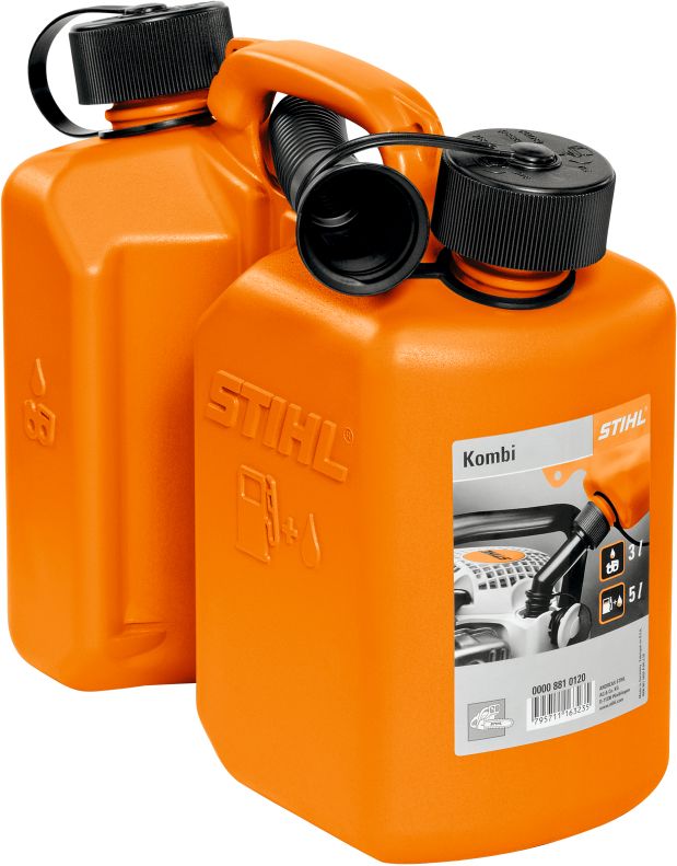 Mit UN-Zulassung, orange. Doppelbehälter für 3 l Kraftstoff und 1,5 l Sägekettenhaftöl. Inklusive Auslaufrohre. Auch bei diesem Kanister können STIHL Einfüllsysteme für Kraftstoff und Sägekettenhaftöl verwendet werden.