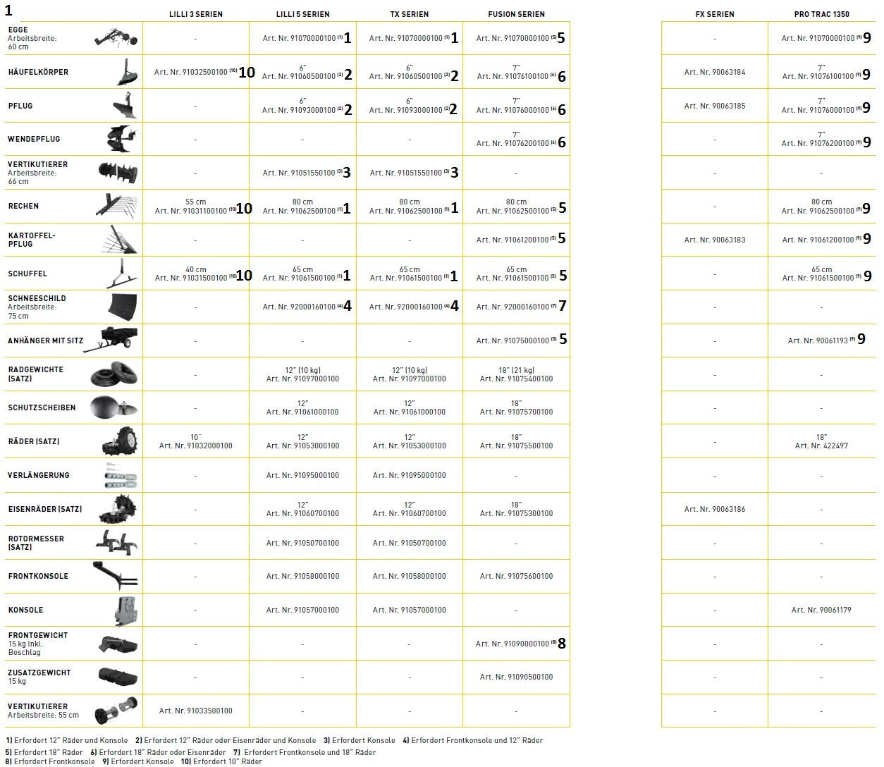 Diese Anbaugeräte erfordern normalerweise zusätzliche Teile. Diese Liste (Abbildung 2) zeigt genau, was für den jeweiligen Anhang noch erforderlich ist.