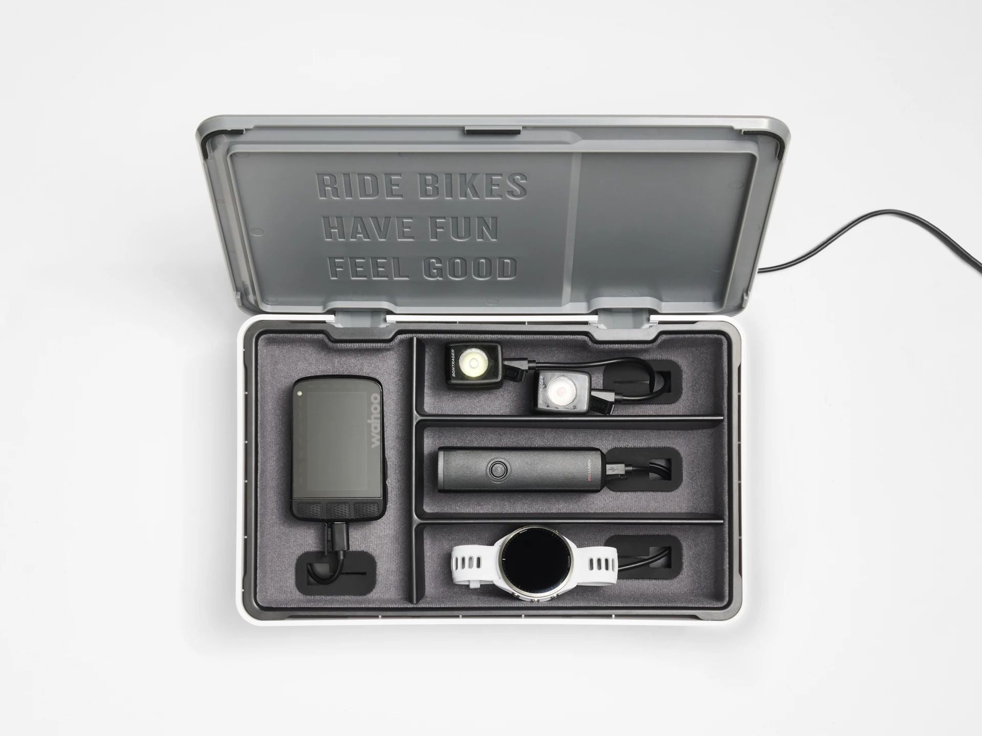 Die Trek CHRGtime Ladestation verhindert nervigen Kabelsalat und lädt deine Fahrradelektronik übersichtlich auf. Mit der Trek CHRGtime Ladestation lädst du dein elektrisches Fahrradzubehör schneller und organisierter auf. Lade bis zu sechs Fahrradleuchten, Computer und andere Geräte in einem aufgeräumten Gehäuse auf, das die mitgelieferten USB-Micro- und USB-C-Ladekabel sauber und versteckt aufnimmt.