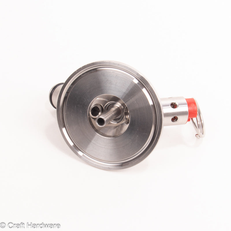 Ein 2″ Tri-Clamp-Adapter mit integriertem NC-Gasventil, NC-Getränkeventil und 2,5 bar Überdruckventil. Das mittlere NC-Ventil ist für den Getränke gedacht und hat eine 6,5 mm große Schlauchtülle auf der Tri-Clamp-Seite für den Anschluss unseres schwimmenden Tauchrohrs. Klemme und Dichtung werden separat verkauft.