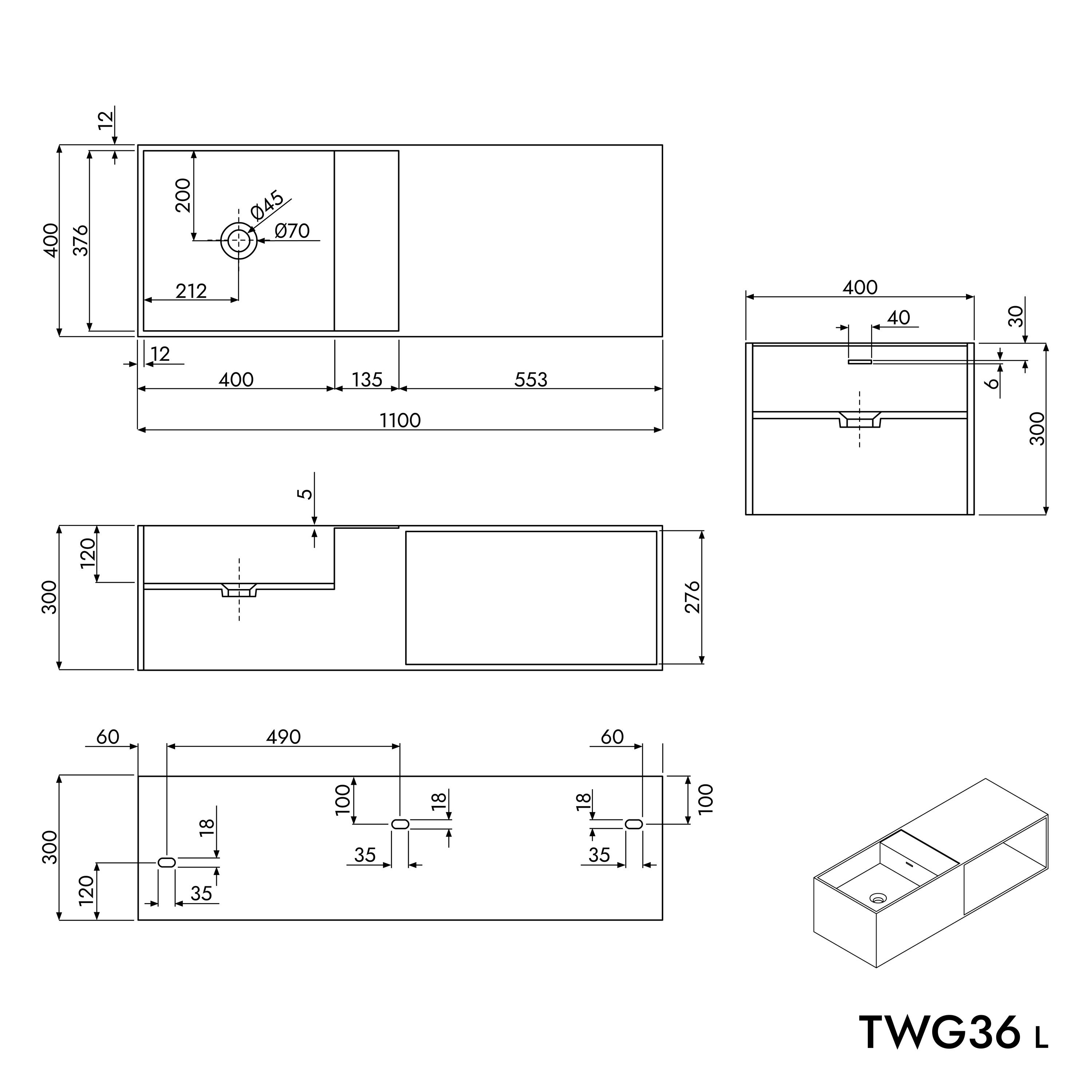 Wandwaschbecken Aufsatzwaschbecken TWG36 aus Mineralguss Solid Stone mit Ablagefach – Weiß matt