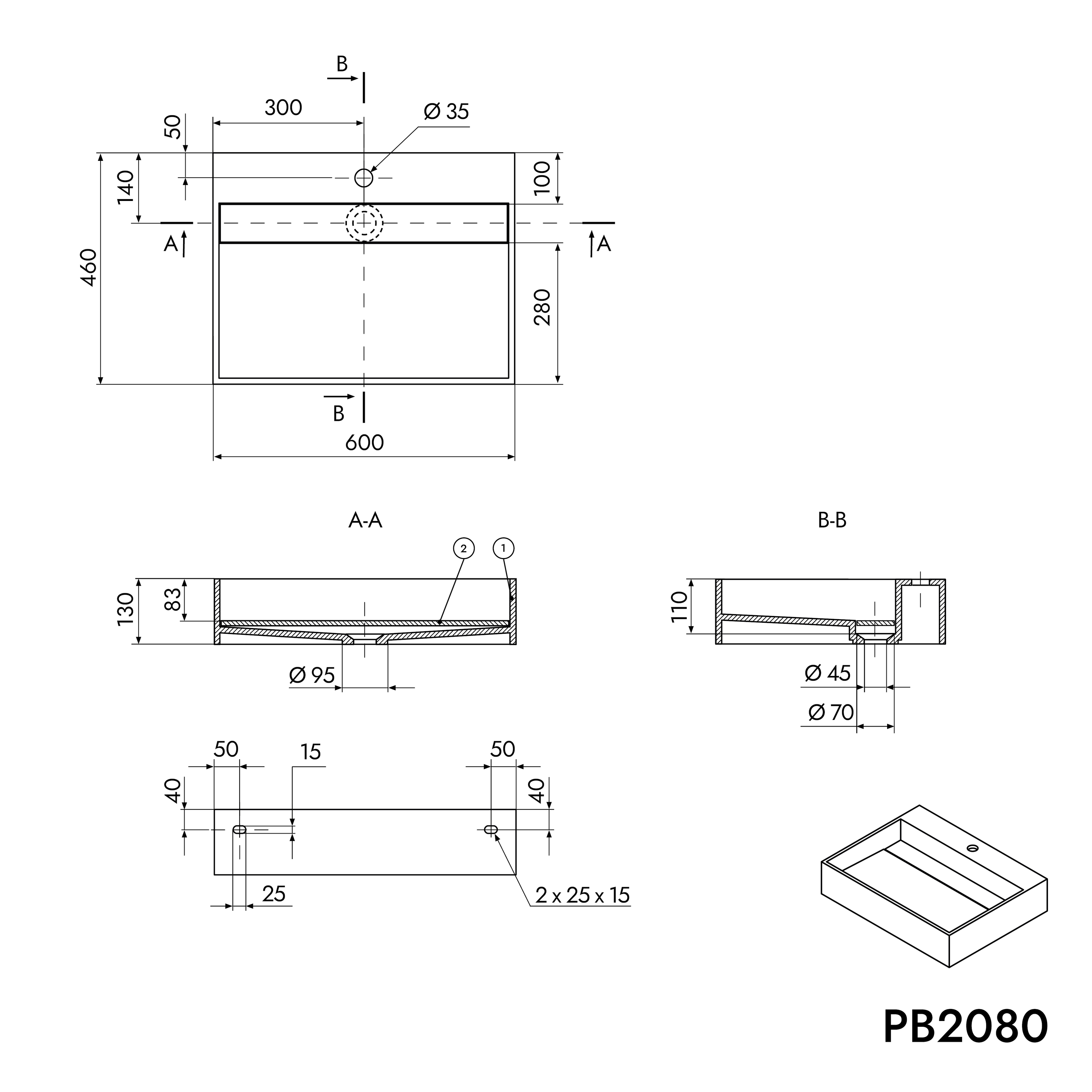 Das Wandwaschbecken PB2080 ist aus hochwertigem Mineralguss (Solid Stone) gefertigt. Die klare, geradlinige Formgebung, die feinen Kanten und der schmale Rand lassen das Becken edel und elegant wirken.