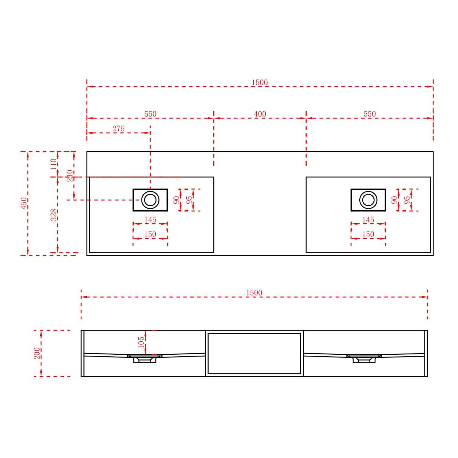 Wandwaschbecken TWG235 aus Mineralguss Solid Stone – Weiß matt – 150 x 45 x 20 cm