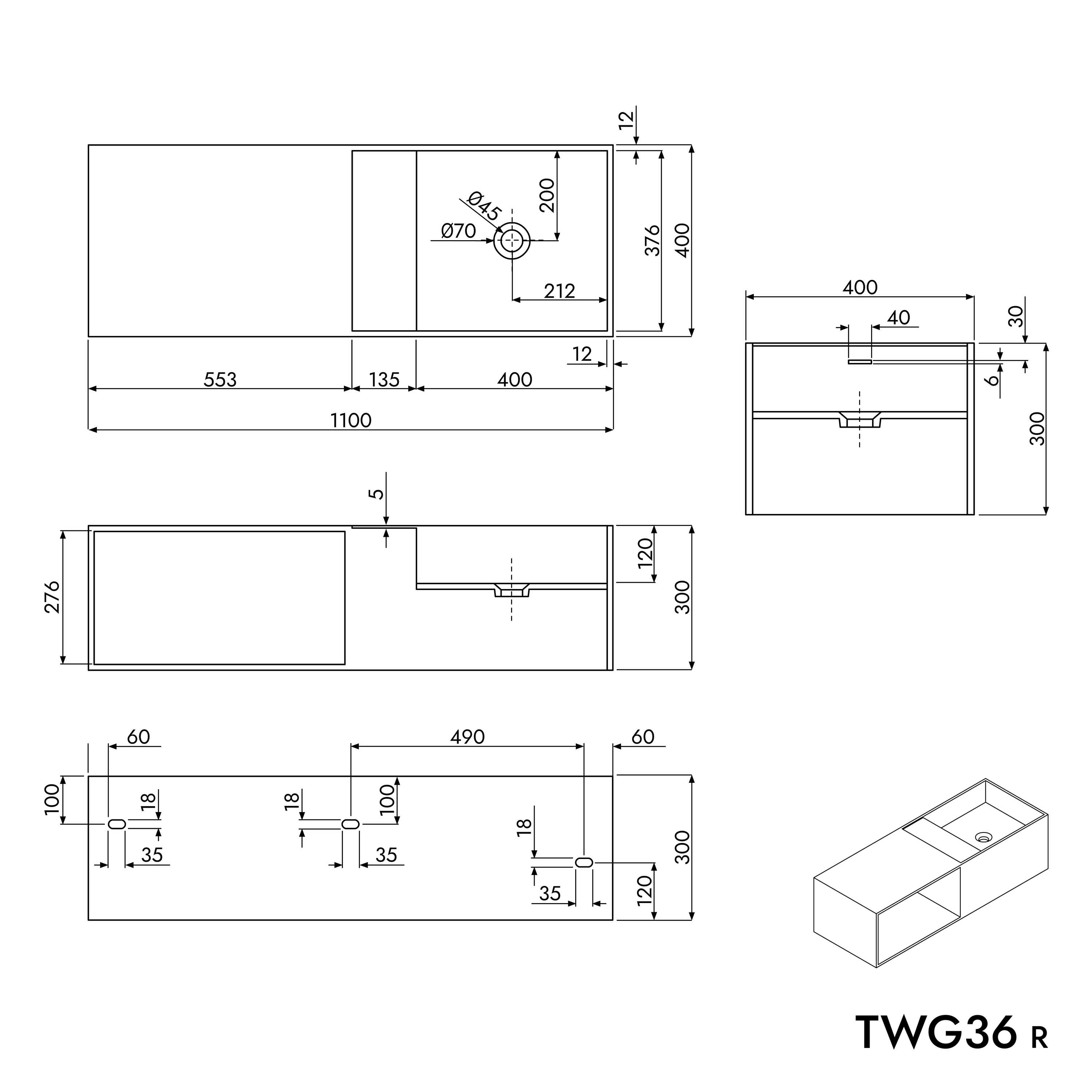 Wandwaschbecken Mineralguss TWG36 in Weiß mit Ablagefach links – 110 x 40 x 30 cm