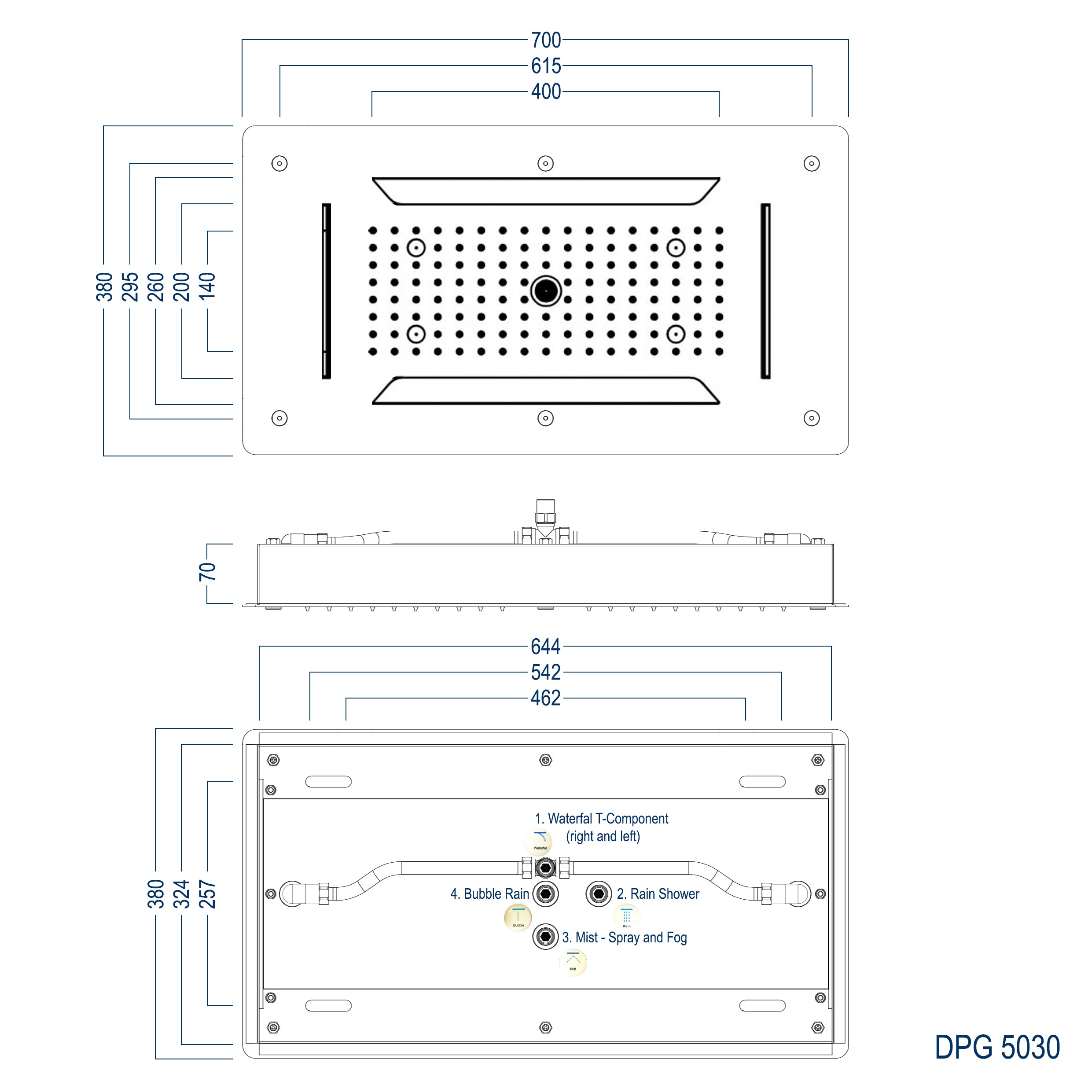 Die edle Deckenbrause DPG5030 in der Größe 70 x 38 x 7,2 cm ist aus hochwertigem Edelstahl hergestellt.